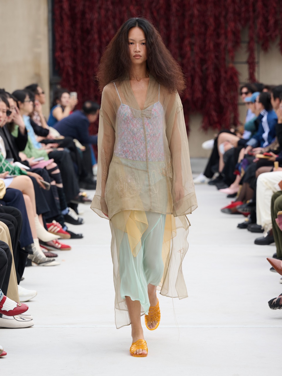 本季的亮点在于同色系的叠穿探索。水洗透蓝牛仔、玉米黄绉纱府绸等材质的巧妙运用,不仅展现了设计师对面料的独到见解,也营造出层次丰富、大气飒爽的整体风格。新推出的"红菊"印花衬衣Pit Shirt与"透玉"色罩裙Janet Slip Dress,则完美诠释了东方美学中的含蓄与洒脱。