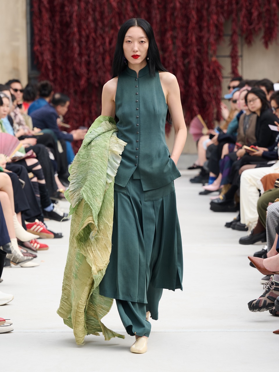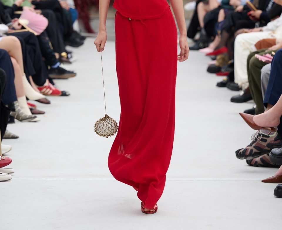 SAMUEL GUÌ YANG的可持续理念在这一季得到了充分体现。通过循环使用库存面料,以及与东边野兽联名推出的口红饰袋,品牌展现了其对环保的坚持。
