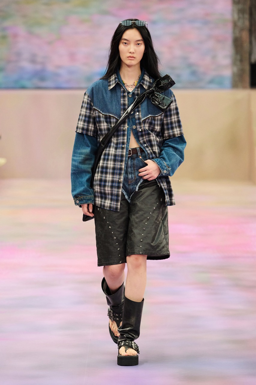 男装向Kurt Cobain致敬,破旧布料与宽大针织衫交织出颓废而富有魅力的垃圾摇滚风格。女装则化身Chloë Sevigny,结构化剪裁与精致蕾丝的碰撞,演绎出一曲不拘一格的优雅颂歌。拼接牛仔、粗线条纹与蕾丝细节的巧妙结合,展现了设计师对材质的独到见解。