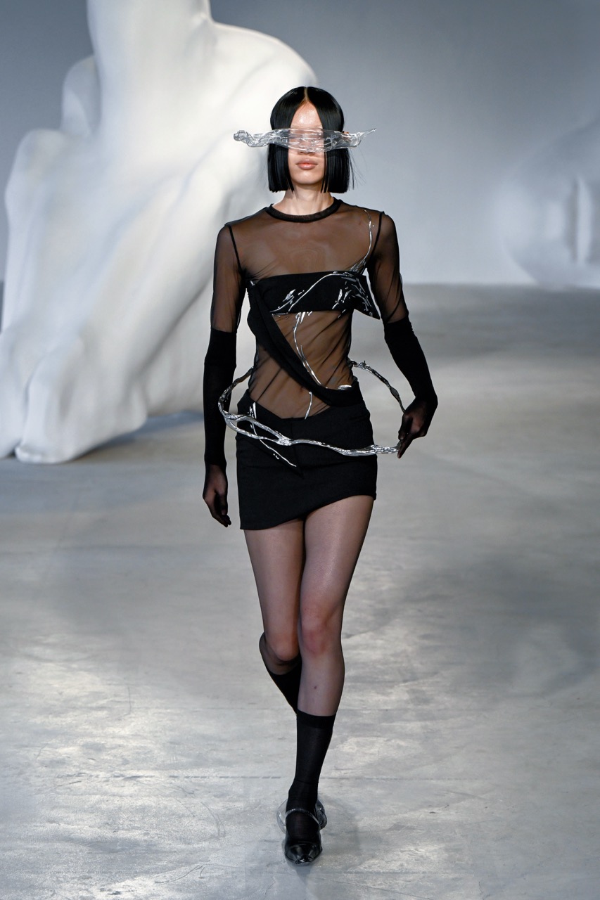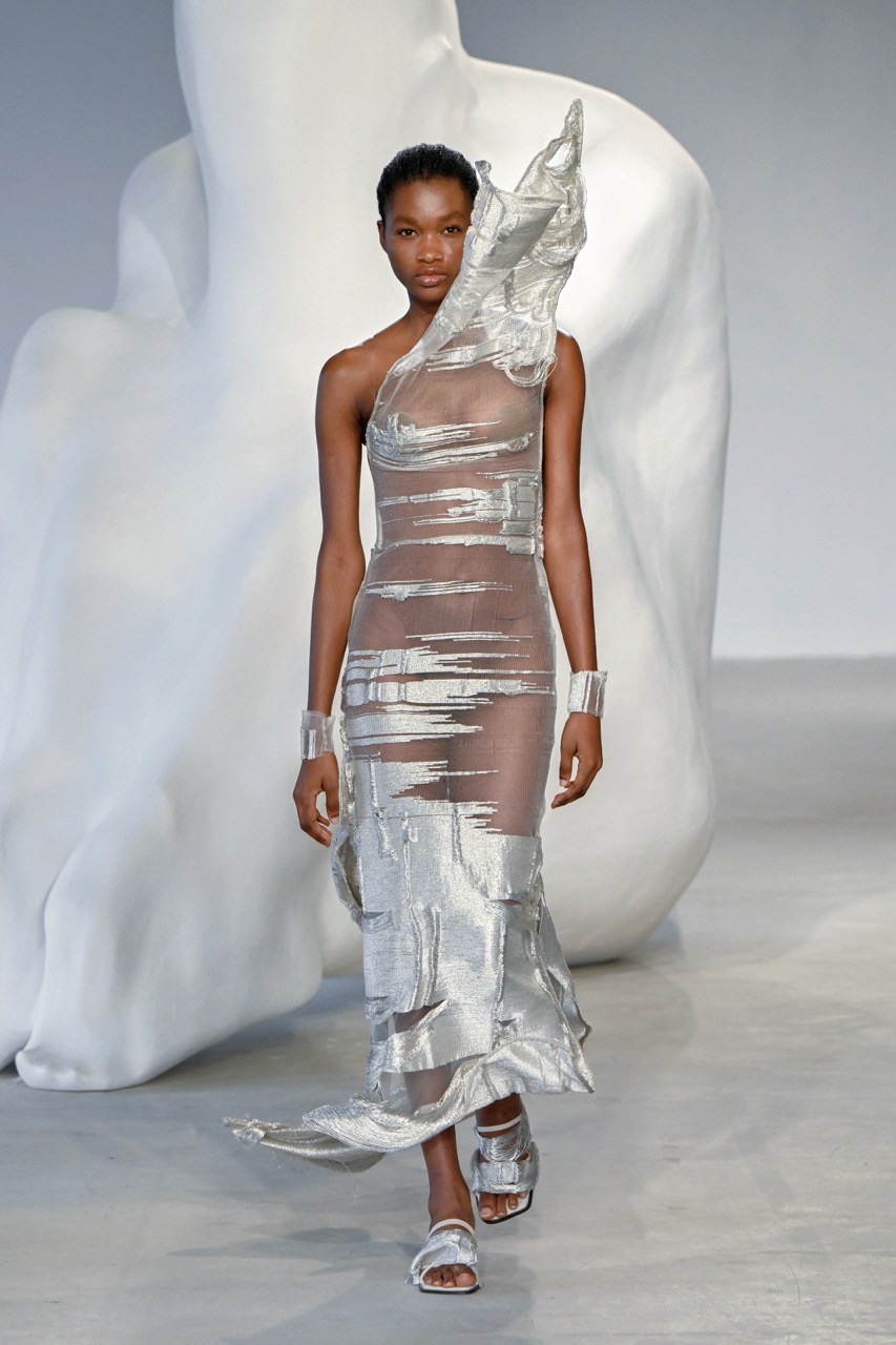 答案在每一件精心打造的作品中徐徐展开。品牌标志性的金属流苏在灯光下闪烁,宛如琥珀中跃动的光芒。液态金属质感的面料则呈现出不可思议的可塑性,将裙摆的飞扬、腰线的婉转永久定格,犹如琥珀中的精美化石。