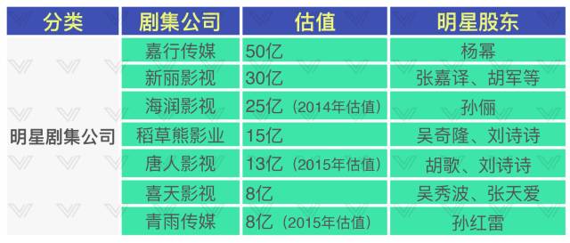 在接下来的阵营中,以新丽传媒、喜天、唐人等中型内容制作公司为主。这批公司的估值在20-40亿之间,且多个公司都有大批明星股东现身,这类公司主要以剧集生产和艺人经纪为主要业务。