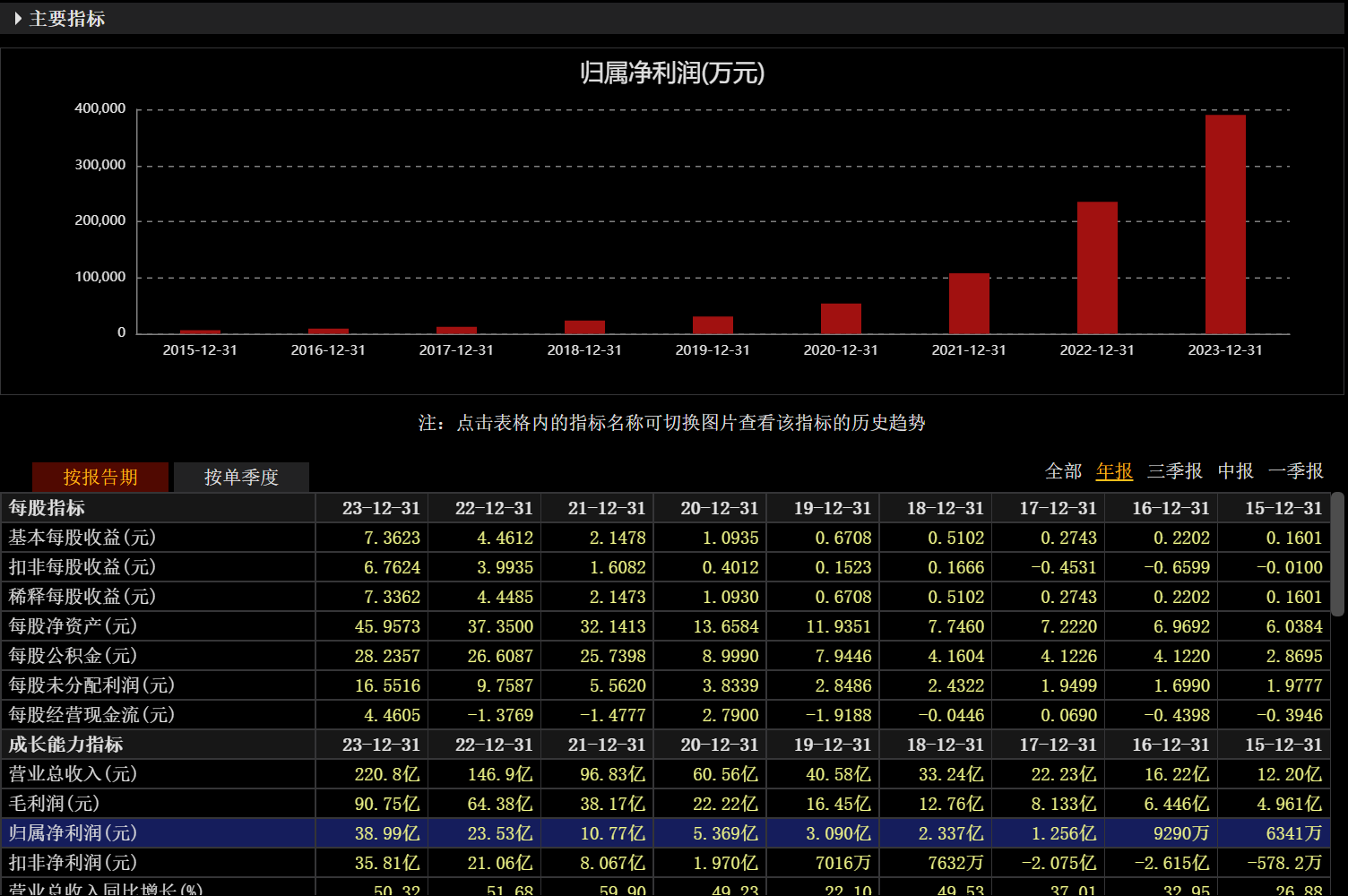 公司预计前三季度实现营业收入188.3亿元至216.8亿元,同比上涨29.08%至48.61%;归母净利润41.3亿元至47.5亿元,同比上涨43.19%至64.69%;扣非归母净利润39.5亿元至45.4亿元,同比上涨49.62%至71.97%。值得注意的是,公司2023年全年实现归母净利润38.99亿元。因此,即使以预测下限的41.3亿元计算,公司前三季度的归母净利润也超过了去年全年。