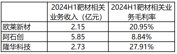 目前,在A股涉及ITO靶材业务的公司有欧莱新材(688530.SH)、阿石创(300706.SZ)、隆华科技(300263.SZ)。从规模看,2024年上半年,欧莱新材、阿石创和隆华科技靶材相关业务分别实现收入2.15亿元、5.85亿元和2.73亿元,对应毛利率分别为20.95%、8.84%和27.91%。