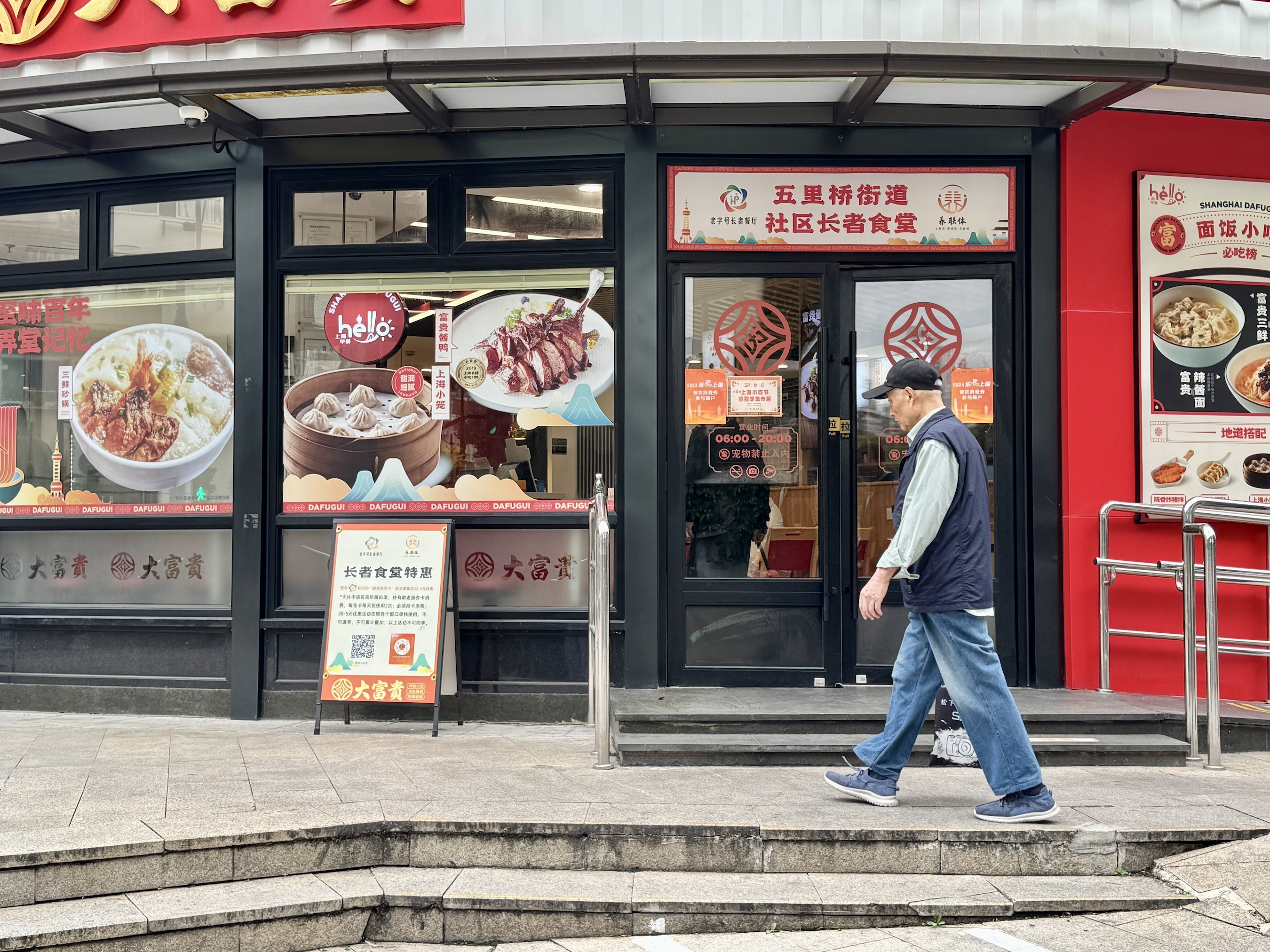 大富贵酒楼鲁班店坐落于黄浦区五里桥街道,这里上海老龄化程度较高的区域,老年人口占比近40%。60岁及以上人口约3.7万人,其中,90岁以上独居老人有155人。