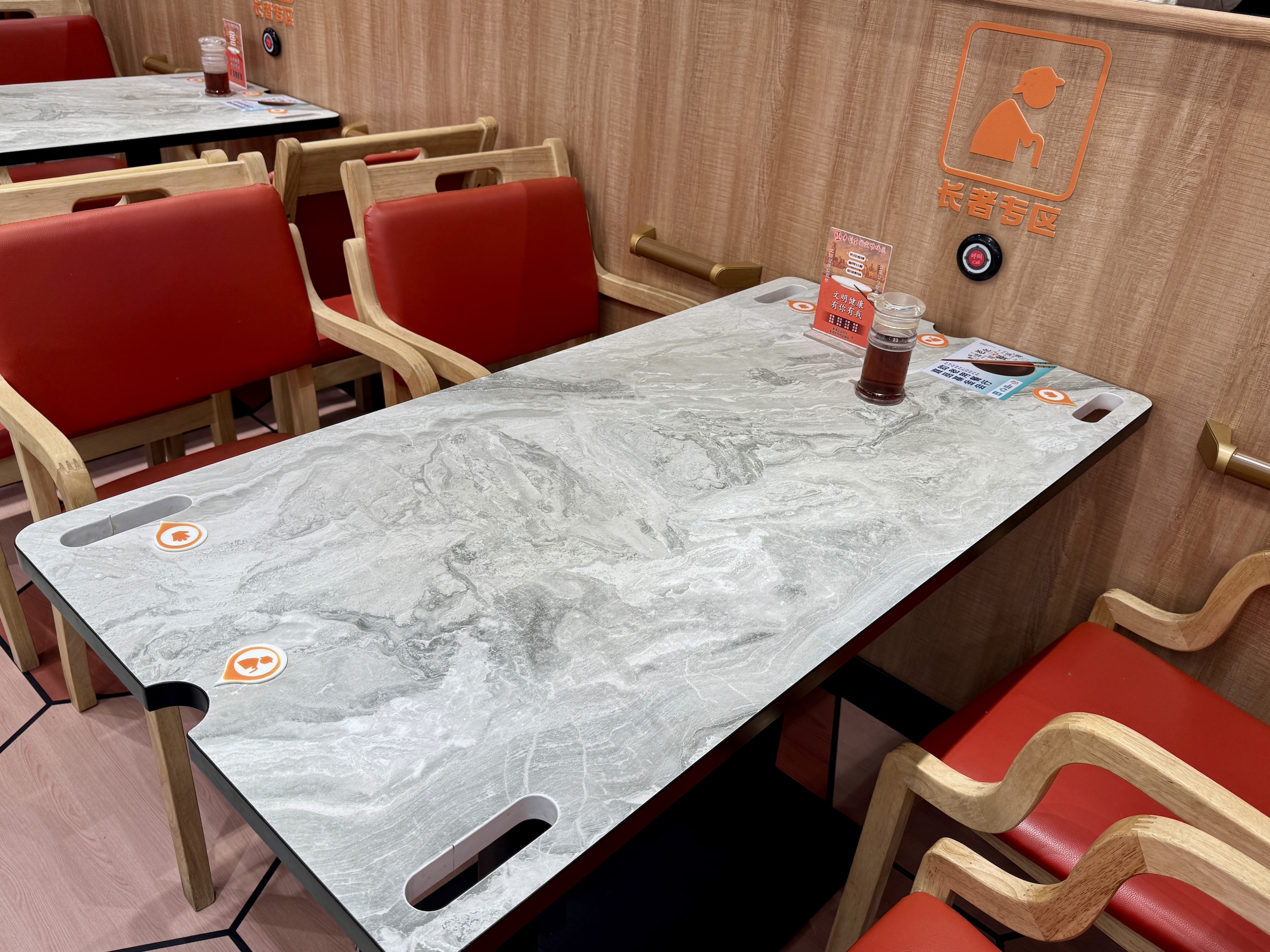 上海大富贵酒楼有限公司党委书记刘立元表示,餐厅还开辟了长者专区,口味配合老人清淡口味,桌椅也更符合老年人使用习惯,桌角镂空方便老年起坐时抓握,桌边配有呼叫服务按钮,餐厅钟表字体也更大更清晰。