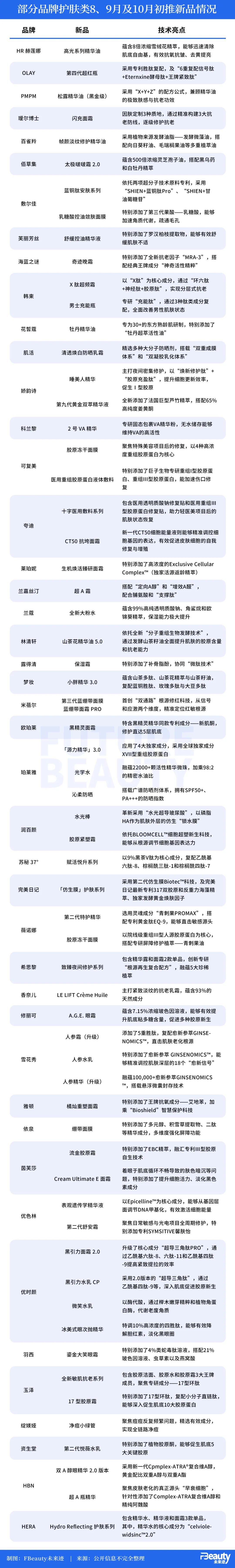 《FBeauty未来迹》发现,双十一前的8、9、10月可以说是品牌的集中推新期,有超过100个品牌进行了新品、新系列,或是大单品升级的发布,其中包括珀莱雅、韩束、花西子、薇诺娜、海蓝之谜、修丽可、OLAY、雅诗兰黛等中外知名品牌。
