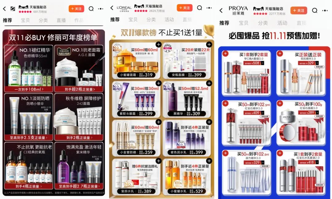 截图自修丽可、巴黎欧莱雅、珀莱雅天猫旗舰店