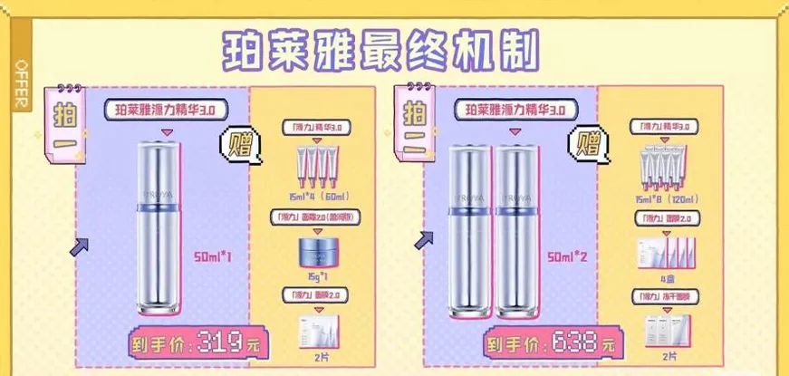 在淘天平台,品牌更多贯彻大单品策略,主推自己持续热卖的超级大单品,并以送正装量、甚至比正装量更大的小样为主,“不止买一送一量”成为了品牌的促销“主旋律”。