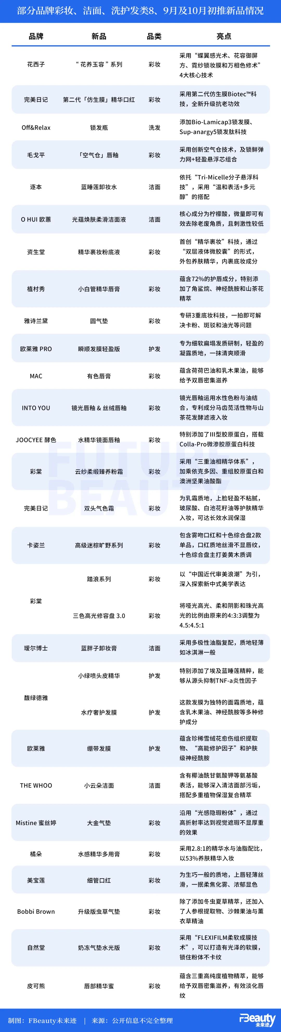 彩妆及洁面、洗护品类也在加速推新中,除开推出热门大单品的升级款,各大彩妆品牌也持续创新风格色彩,例如花西子“花养玉容”系列、彩棠踏浪系列都在探索新中式美学表达。完美日记第二代「仿生膜」精华口红、资生堂精华裹妆粉底液、自然堂奶冻气垫水光版等新品,则展示出彩妆品牌对于功效融合领域的探索。