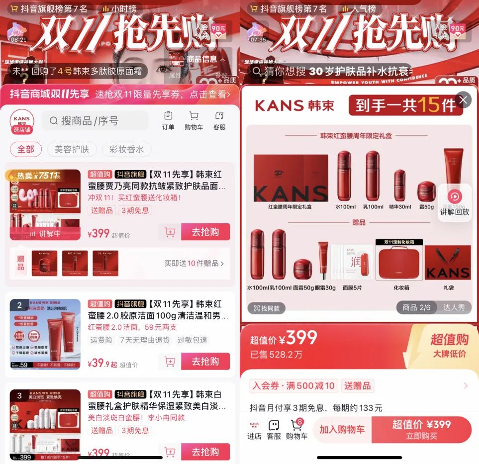 在抖音平台,品牌则以产品组合促销为主,在抖音“双11抢先购”中,各大品牌自播间主推爆款产品套组,例如持续蝉联抖音护肤类第一的韩束,主推其经典红蛮腰系列,其礼盒中直接送正装量的水、乳、面霜、眼霜以及面膜等,可以说也超过了买一送一的程度。直播间不少消费者也直言“优惠力度相当大”。