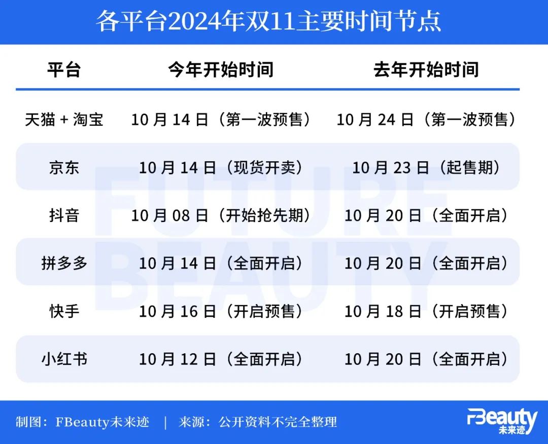今年双十一,各平台纷纷将开始的时间提前,淘天恢复了预售机制,并将预售时间提前了10天;京东原本在10月10日突然宣布时间再次提前,即在10月14日晚8点现货开卖,直接对上当日开启预售的淘天。