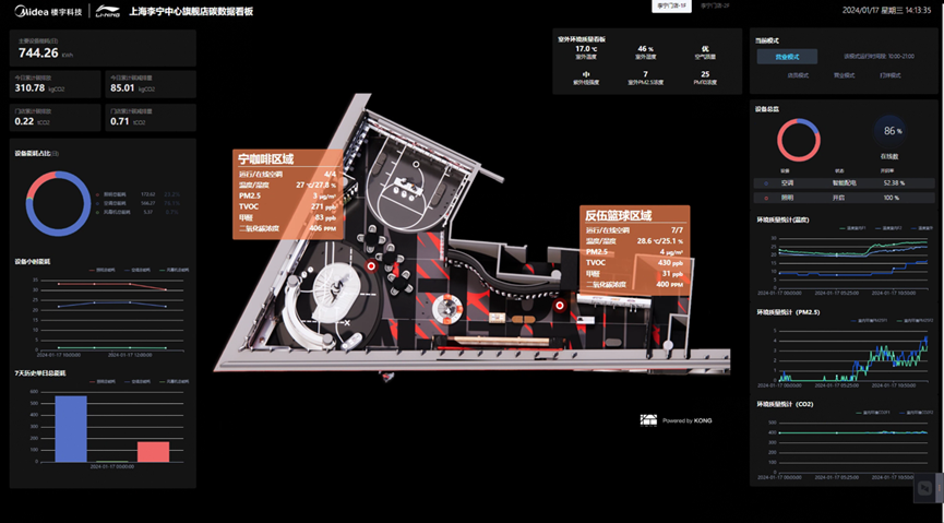 李宁还积极探索门店的低碳运营,上海李宁中心旗舰店在设计与运营中深度融合了环保理念——使用以秸秆为基底的秸板和高回收比例的亚克力等环保建材和回收材料,调整了照明方案,相较传统方案灯光数量降低18%,还搭建实时能耗监测和智慧控制系统,店内用电设备可智能切换,预计每年减少二氧化碳排放13.5吨。