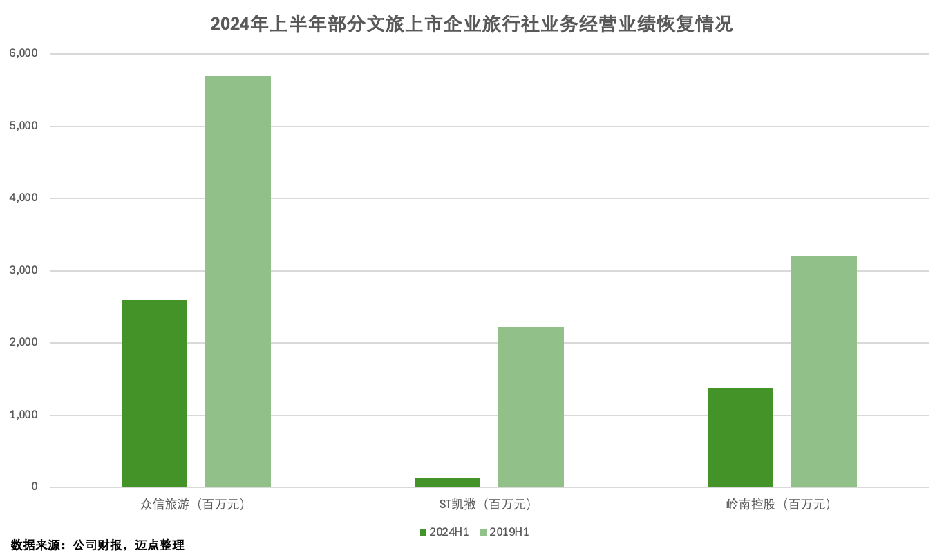 这家创立于19世纪的全球第一家旅行社如今面临的窘境,恰是全球旅行社行业的缩影。在刚刚过去的2024年上半年,A股市场中的旅行社上市公司,同样在困境中徘徊。例如,众信旅游(SZ:002707)、ST凯撒(SZ:000796)、岭南控股(SZ:000524)的旅行社业务收入,仅恢复至2019年同期的45.58%、6.02%和42.93%,虽然他们大多将其归咎于出境游市场尚处恢复期,但在2019年之前,即使文旅市场规模依旧保持逐年增长,其经营业绩却只能用稳定来形容。