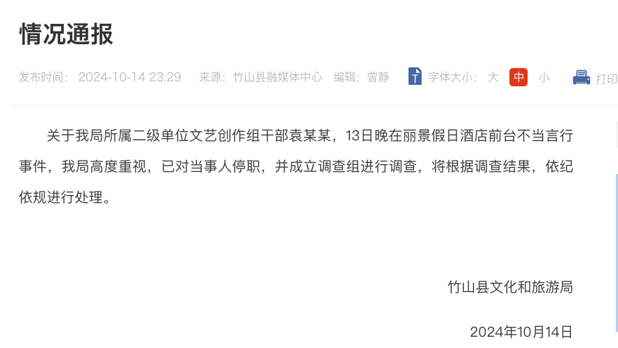 近日,有网民爆料称,13日晚8时左右,湖北省十堰市竹山县文旅局干部袁某某被爆酒后在竹山丽景假日酒店闹事,辱骂前台工作人员,并扬言“在竹山我说了算”。竹山县文化和旅游局10月14日晚通报,关于该局所属二级单位文艺创作组干部袁某某,13日晚在丽景假日酒店前台不当言行事件,文旅局高度重视,已对当事人停职,并成立调查组进行调查,将根据调查结果,依纪依规进行处理。