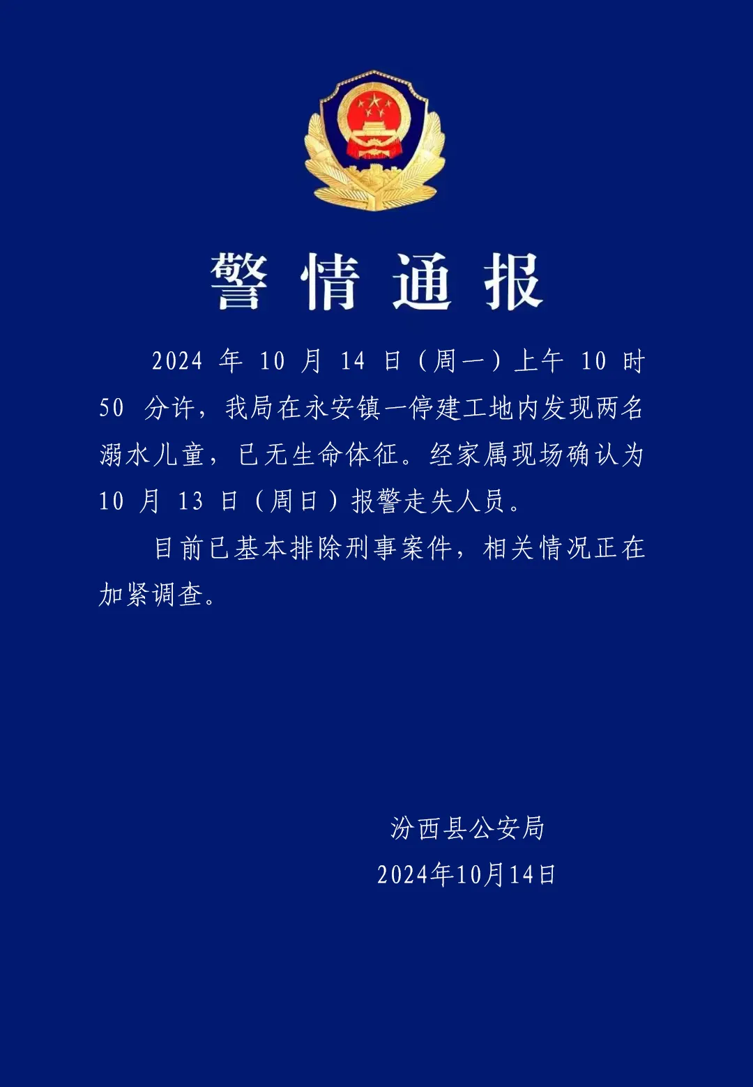 山西汾西县公安局10月14日晚通报,10月14日(周一)上午10时50分许,汾西县公安局在永安镇一停建工地内发现两名溺水儿童,已无生命体征。经家属现场确认为10月13日(周日)报警走失人员。目前已基本排除刑事案件,相关情况正在加紧调查。