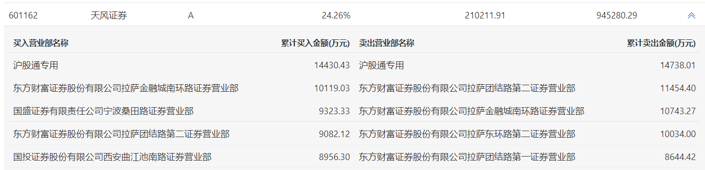 天风证券今日涨3.5%,龙虎榜数据显示,上榜营业部席位全天成交10.75亿元,占当日总成交金额比例为11.37%。其中,买入金额为5.19亿元,卖出金额为5.56亿元,合计净卖出3702.89万元。