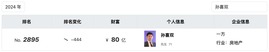 孙喜双2009年至今14次登陆胡润百富榜,2024年,其以80亿身价位列《胡润全球富豪榜》,但名次较前一年下降444位。