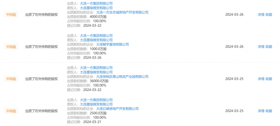 一方集团的经营范围包括项目投资、房屋租赁、物业管理、酒店管理、企业管理咨询服等。企查查显示,2024年上半年,一方集团新增多起股权出质信息,出质股权总额超4.65亿股。