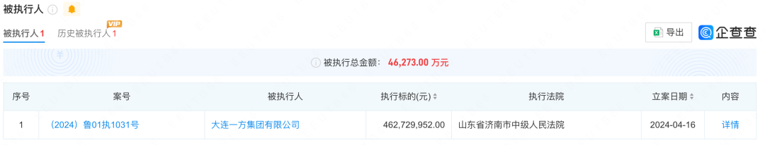 今年4月16日,一方集团还新增一条被执行信息,被执行总金额4.63亿元。
