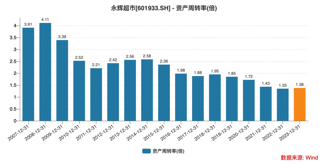 与此同时,公司的资产周转率正处于上市以来的最低水平,2021-2023年分别为1.43倍、1.35倍、1.38倍。