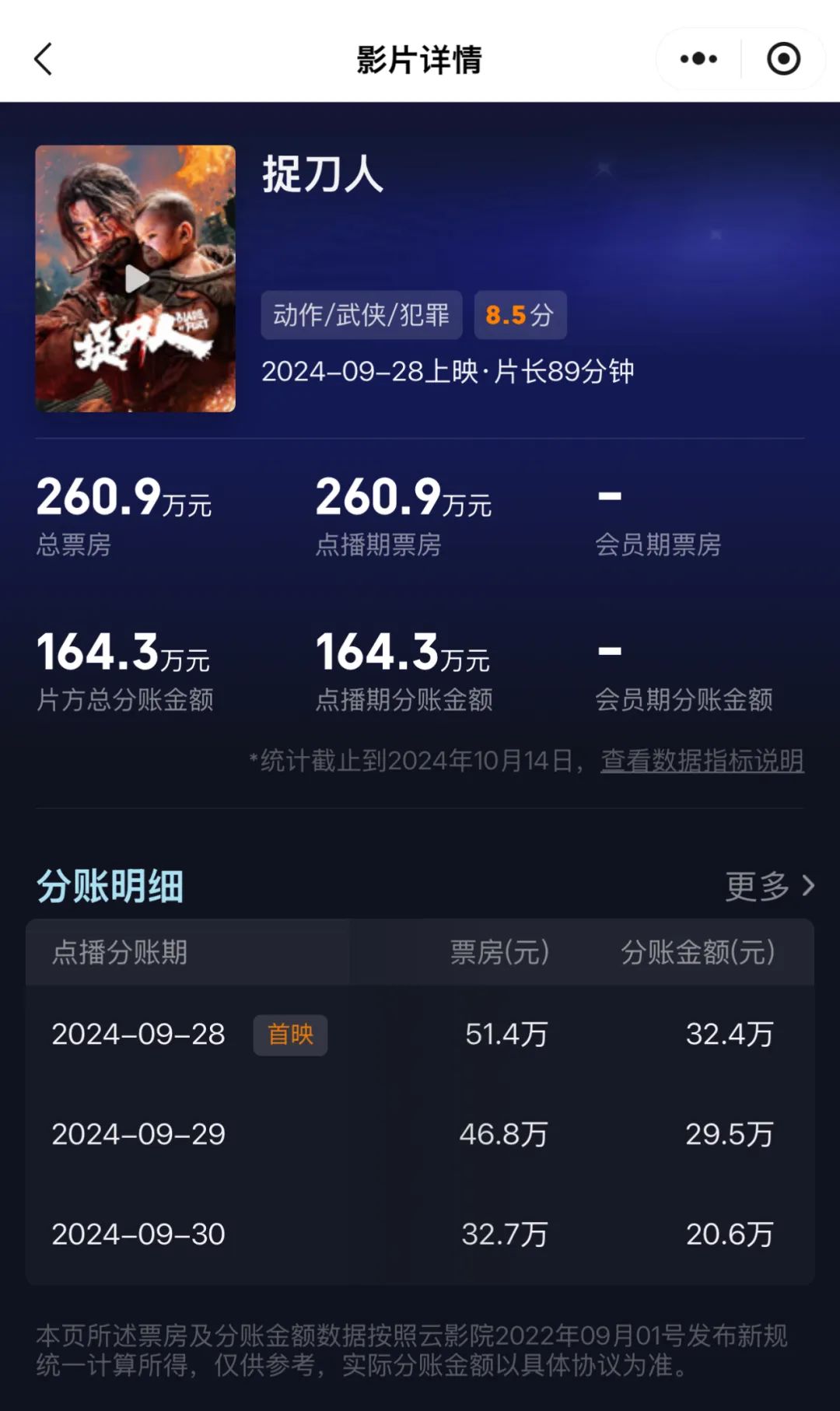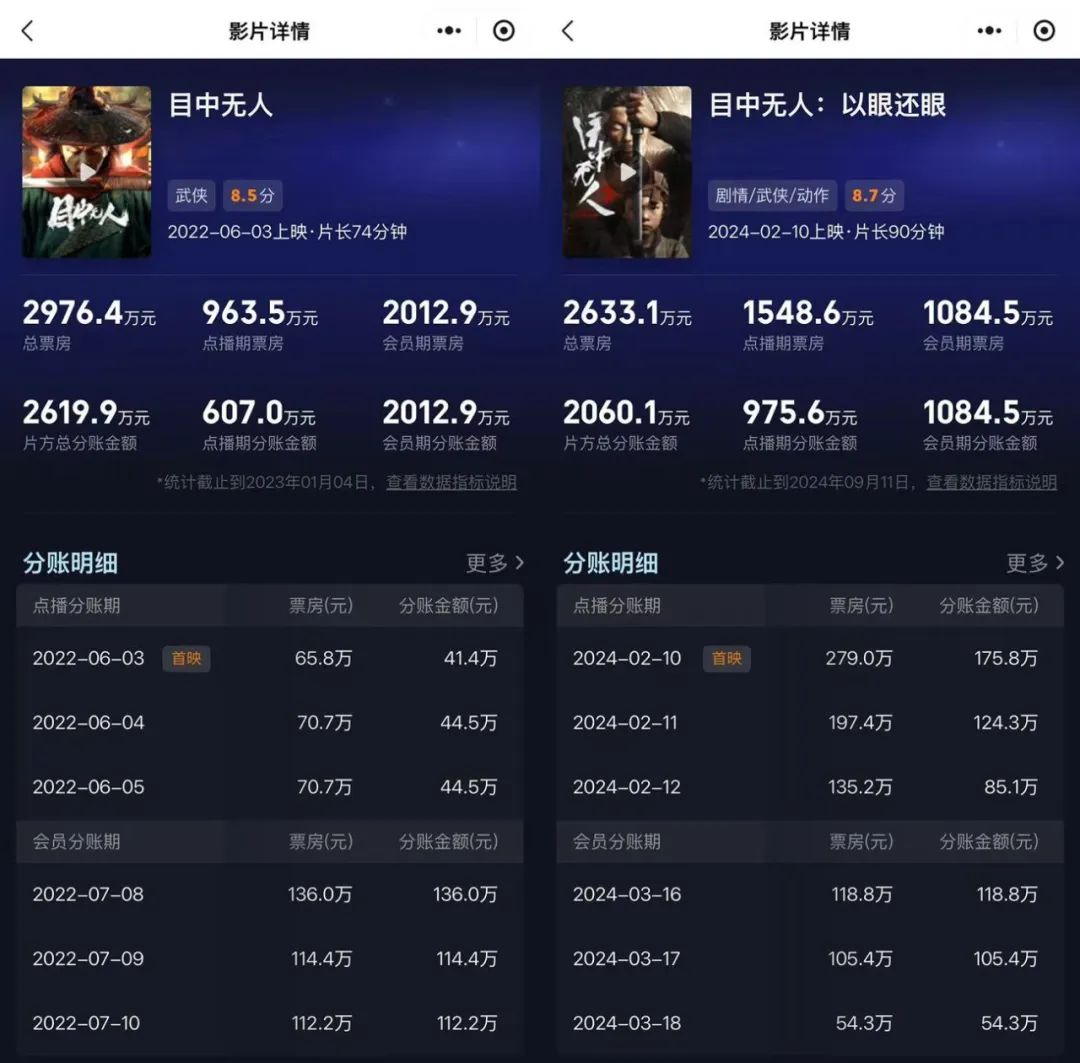 而在该片保住系列高品质的同时,票房表现却惨不忍睹。截至10月15日,该片上线18天点播票房仅有260.9万元,与两部《目中无人》的点播票房相差甚远,目前总票房更是不及《目中无人》的十分之一。