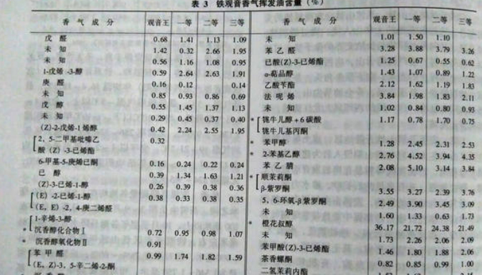 一般来说这种产在安溪的“红芽歪尾桃”的纯种铁观音都被用来制作一些特级铁观音,我们专门找来一份由中国农业出版社出版的《中国名茶志》里面收录的铁观音香气挥发油含量表来作分析。
