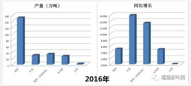 2016年我国茶叶总生产规模在发展惯性作用下继续扩张。根据国家茶叶产业技术体系与中国农业科学院茶叶研究所经济研究室调研数据,2016年全国茶园总面积约为4448万亩,比上年增加132万亩,同比增长3.05%,其中开采面积约3578万亩,同比增长约5.64%。2016年全国干茶总产量约为244.54万吨,同比增长7.37%。2016年茶类生产结构继续调整,干毛茶产量中绿茶、乌龙茶占比继续下降,分别为61.71%和11.09%;红茶占比超过乌龙茶,达到12.18%;黑茶(不含普洱)占比有所提升,为8.51%。其中,绿茶产量约150.91万吨,同比增长4.94%;红茶、黑茶(含普洱茶)产量约分别增长15.88%和13.35%,分别达到29.79万吨、33.48万吨;乌龙茶产量约为27.12万吨,增长4.80%;白茶产量保持平稳,约为2万吨。2016年,名优茶产量继续增长,突破100万吨。2016年茶叶一产产值估计约为1702亿元,同比增长12.04%。