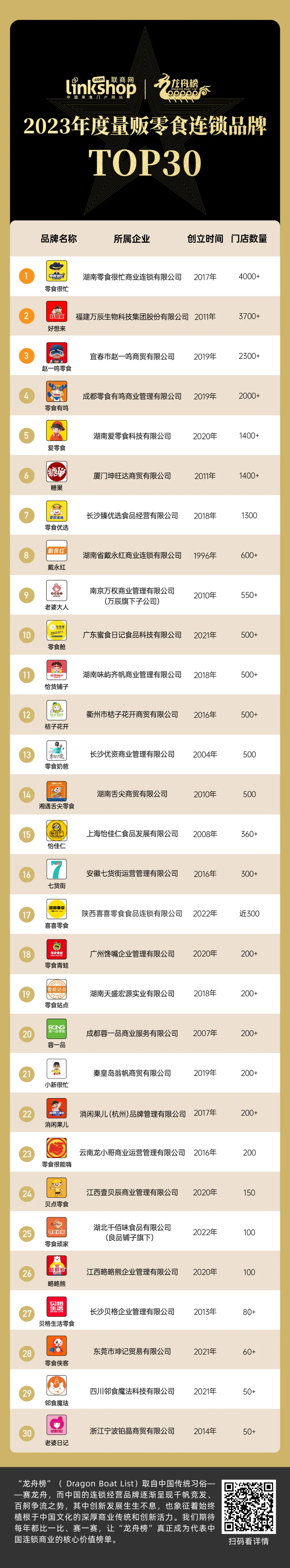 根据联商网发布的《2023年度量贩零食连锁品牌TOP30》,零食有鸣位列第四,排位仅次于零食很忙、好想来、赵一鸣零食。