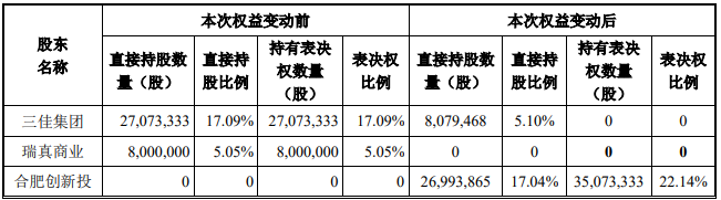 其中,合肥创新投收购三佳集团持有文一科技18,993,865股股份,占文一科技总股本的11.99%;收购瑞真商业持有文一科技800万股股份,占文一科技总股本的5.05%。