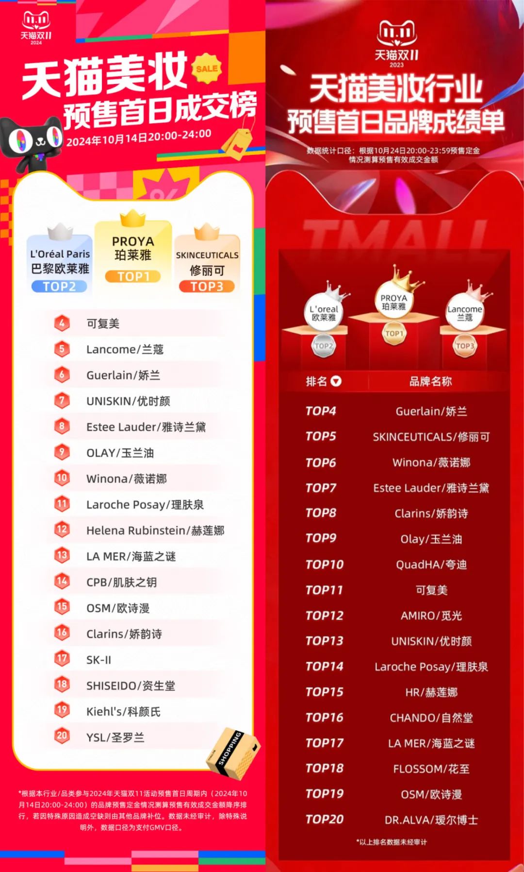 • 左:2024年天猫双十一预售榜单;右:2023年天猫双十一预售榜单