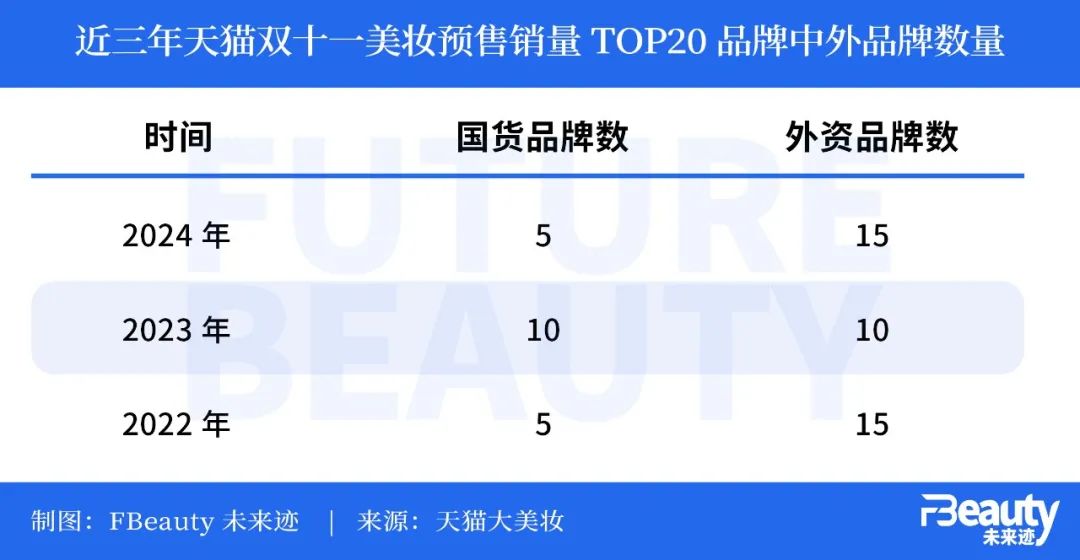 但仔细盘一盘,又能发现一些显著的变化,例如国货品牌在“双11天猫美妆预售首日成交榜TOP20”中的席位,2024年对比2023年从10个下降到了5个,外资品牌反而“扳回一城”。
