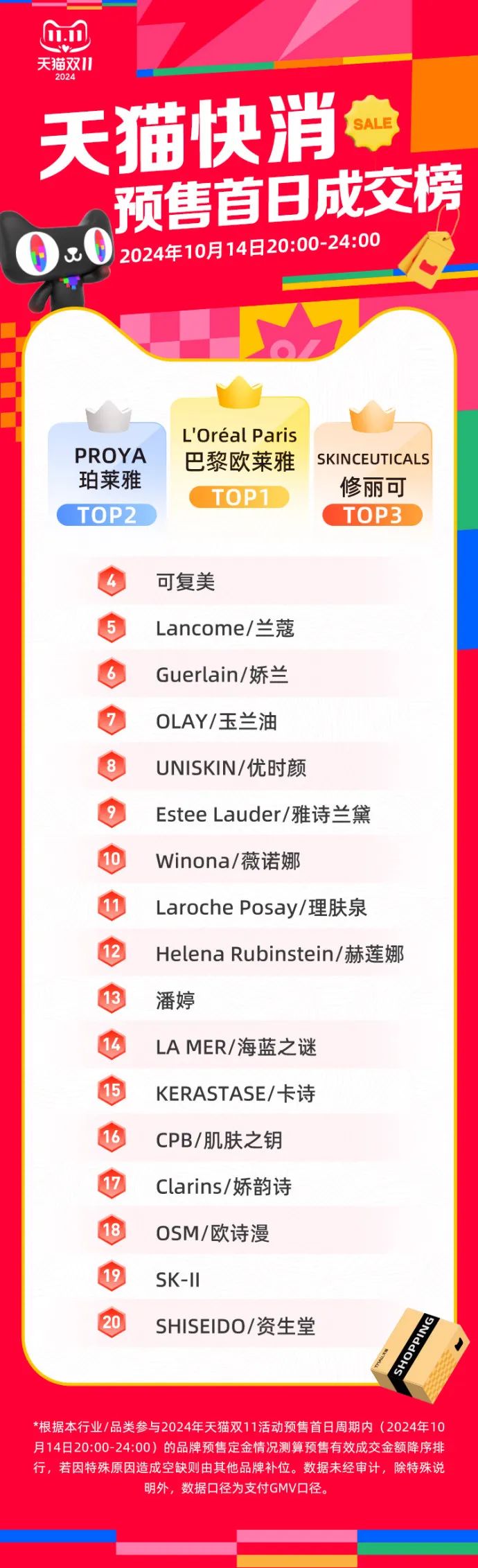 根据“天猫美妆预售首日成交榜”(10月14日20:00-24:00),前三名的品牌分别为珀莱雅、巴黎欧莱雅、修丽可。珀莱雅守住了第一的“宝座”,巴黎欧莱雅紧随其后,修丽可首次闯入前三。