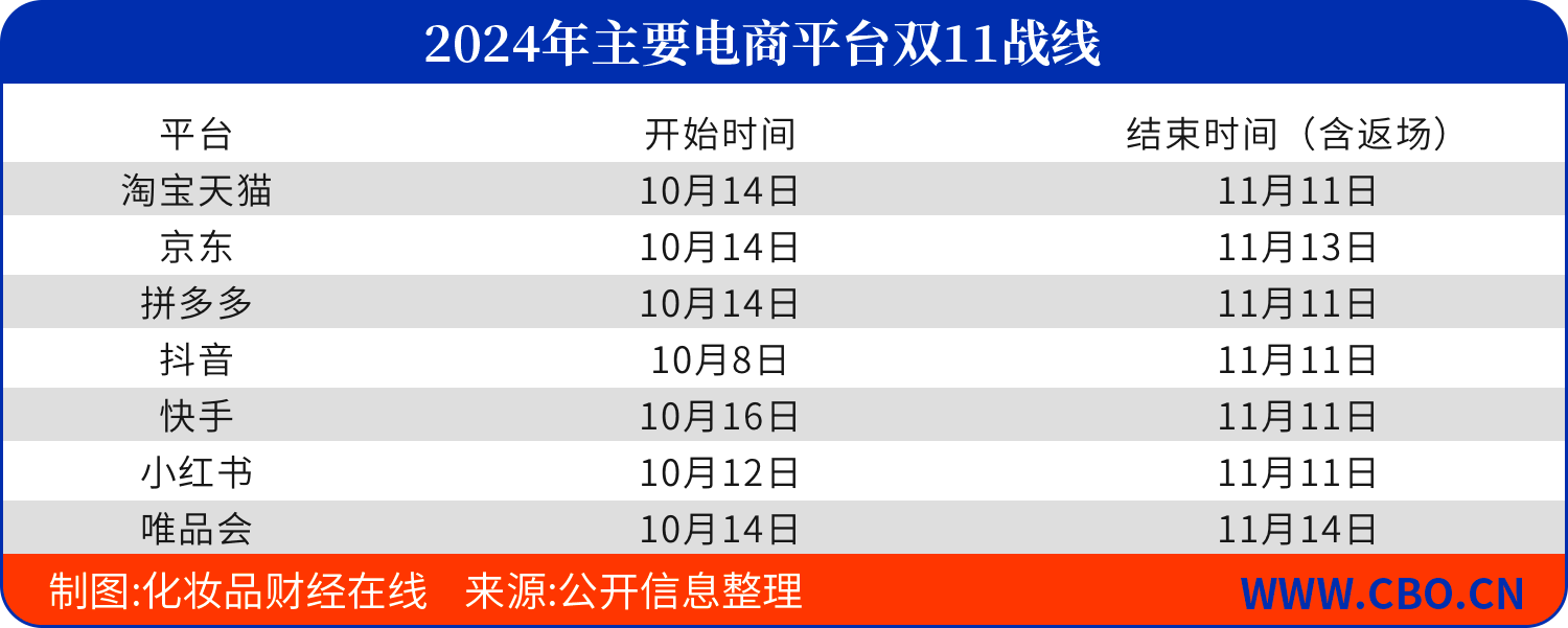 10月14日晚,天猫、京东、拼多多同时开始今年“双11”大促预售。而此前,10月8日起,拼多多、京东、抖音等平台便已经开启双十一补贴、降价等活动,其中,抖音开始得最早,结束得最晚(加上后期返场)。可以说,从10月8日至双十一当天,今年的双十一战线持续时间超过一个月。
