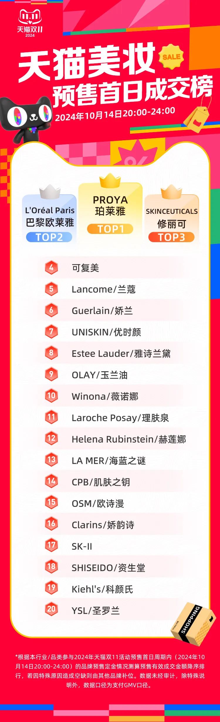 此外,在618取消预售效果不佳后,本次双十一预售环节再次回归天猫。天猫官方数据显示,双11刚开始的十分钟内,珀莱雅、欧莱雅、修丽可、兰蔻、可复美、娇兰、雅诗兰黛、赫莲娜、玉兰油、海蓝之谜、娇韵诗、肌肤之钥、欧诗漫等13个品牌相继破亿,前30分钟破亿品牌达20个。