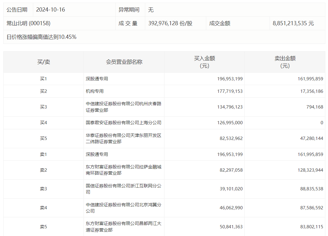 常山北明10月16日涨停,录得20天11板,成交额88.51亿元,换手率24.75%,盘后龙虎榜数据显示,深股通专用席位买入1.97亿元并卖出1.62亿元。