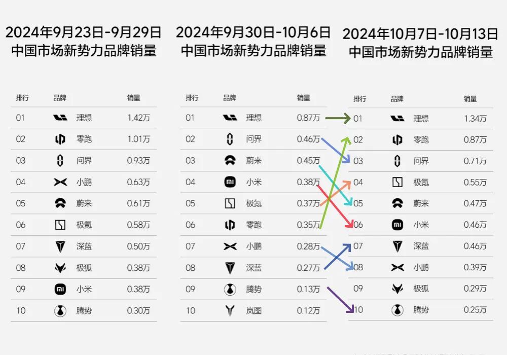 车东西10月16日消息,今日,中国市场新势力品牌2024年第41周(10.7-10.13)周销量榜单公布。