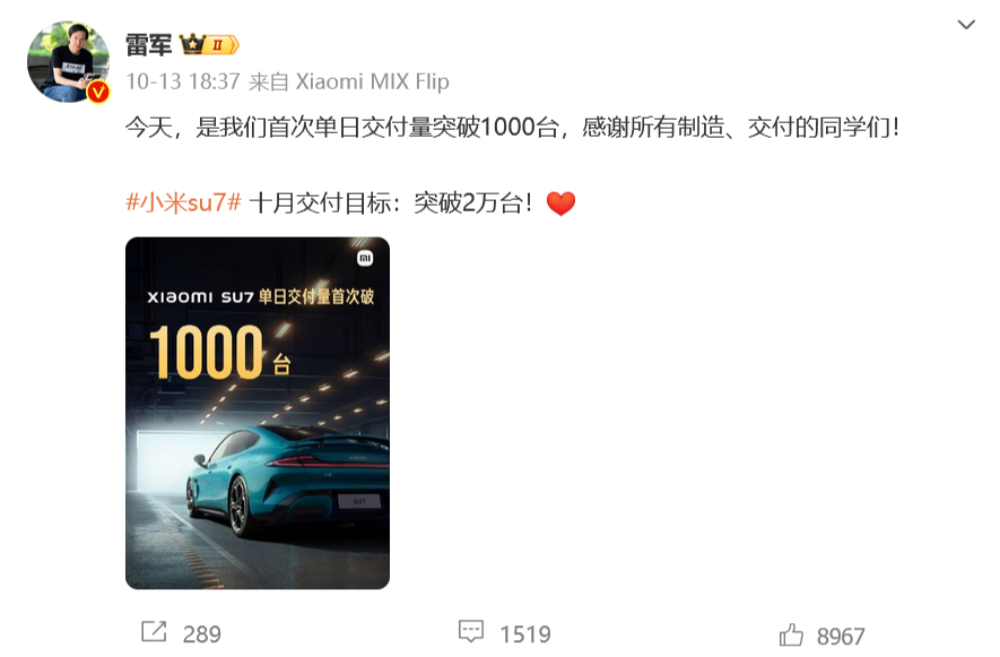 小米公司创始人雷军在其社交平台上发文宣布,小米汽车旗下的SU7车型首次实现单日交付量突破1000台,还重申了10月要交付2万台的目标。