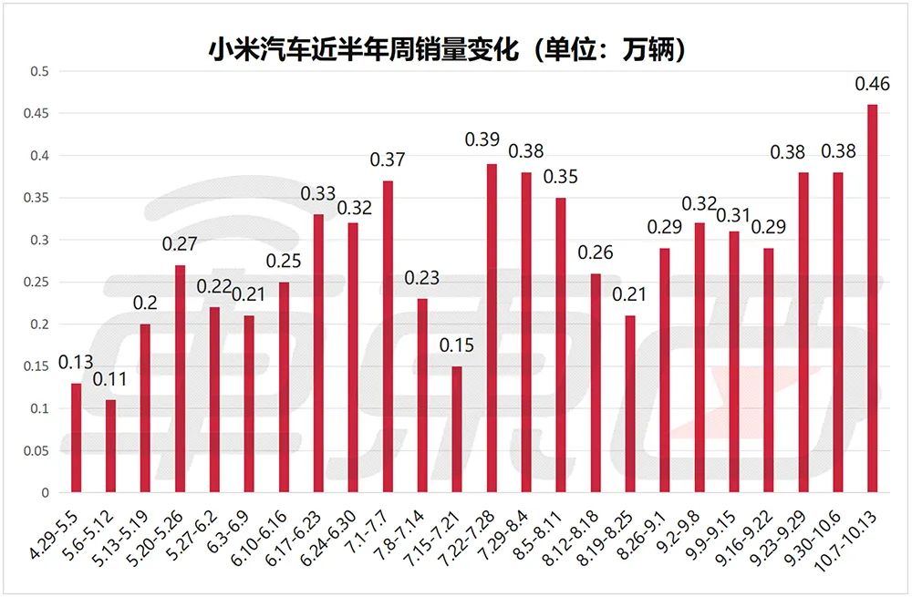 一周卖车4600台!小米拿到了发布以来最好周销,在前两周连续都取得了3800辆销量后,最新一周销量再增长超2成。