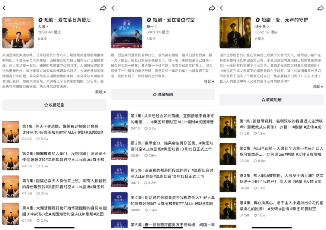 毕竟从播放数据来看,在国庆期间,这三部微短剧总曝光量接近9000万,全部登榜抖音短剧TOP10,其中《爱在落日黄昏后》位居第二名,《爱在错位时空》位居第三名,《爱,无声的守护》位居第七名;值得一提的是,汤小鱼主演的《爱,无声的守护》单集播放量破1700万,成为短剧广场以及抖音内容榜单爆款作品案例;“岚图知音时空ALL IN剧场”话题火速霸榜,收获了一大波流量和关注度。