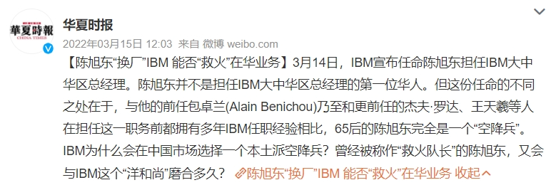 凭借着不同行业的丰富历练和领导经验,2022 年3月,陈旭东“空降”加入IBM担任大中华区总经理,并在之后出任IBM大中华区董事长兼总经理,成为IBM大中华区的“一号位”。
