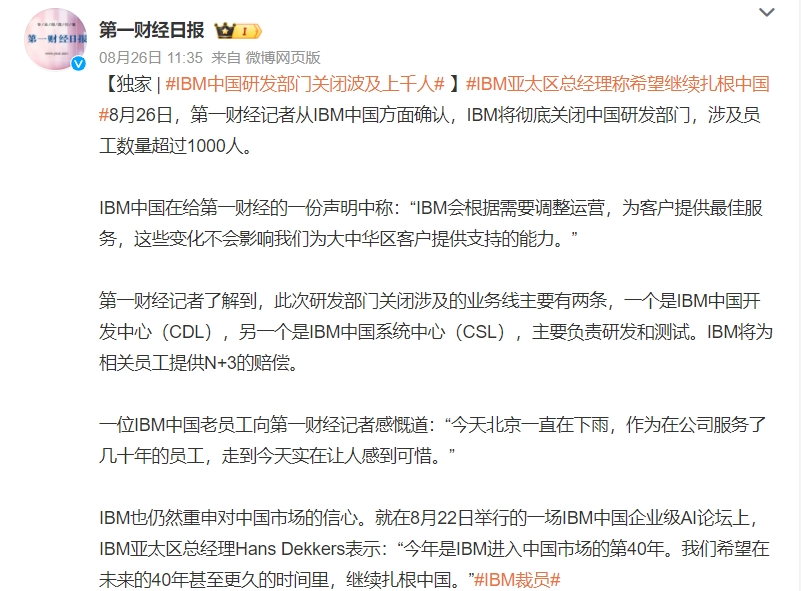 对于IBM中国而言,此次大规模的裁员和部门关停或许也是其在当前困境下的无奈选择。尽管IBM宣称会根据需要调整运营,为客户提供最佳服务,但关闭这些核心研发部门后,IBM可能进一步削弱其在中国市场的研发实力和创新能力,并且难以快速推出符合中国市场特色的产品和解决方案。