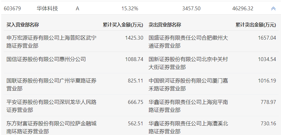 华体科技今日涨停,龙虎榜数据显示,上榜营业部席位全天成交9785.31万元,占当日总成交金额比例为21.14%。其中,买入金额为4568.41万元,卖出金额为5216.9万元,合计净卖出648.49万元。