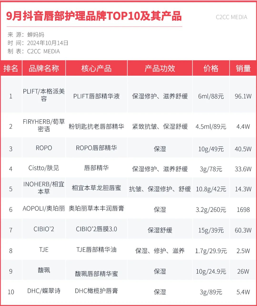 其中,膏/霜、凝胶/啫喱类产品市场占比较高;乳状质地在今年讨论量激增了133.5%,展现出较强市场潜力;精华类在今年各平台销售表现良好,平台讨论声量上涨96.6%,以笔者梳理的9月抖音唇部护理品牌TOP10榜单为例,七成为唇部精华产品。