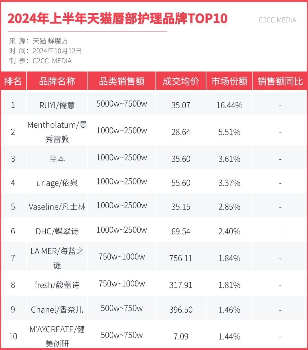 此外,在C2CC传媒X新妆整理的天猫、抖音上半年品牌TOP10中不难发现,天猫、抖音唇部护理TOP10品牌分别占平台40.73%、47.06%的市场份额。