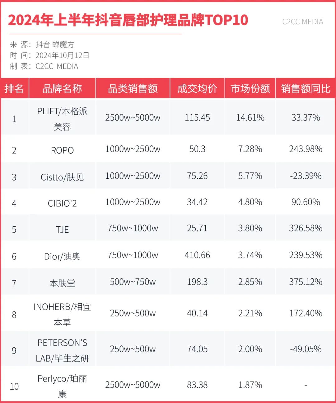 去年,C2CC传媒X新妆曾对抖音平台中PLIFT本格派美容、Cistto肤见两个品牌进行拆解分析(增速185%!这些品牌正在吃唇护赛道的红利 | 鲜锋)。今年,笔者发现除PLIFT本格派美容、Cistto肤见外,还有部分品牌也获得不错增长。