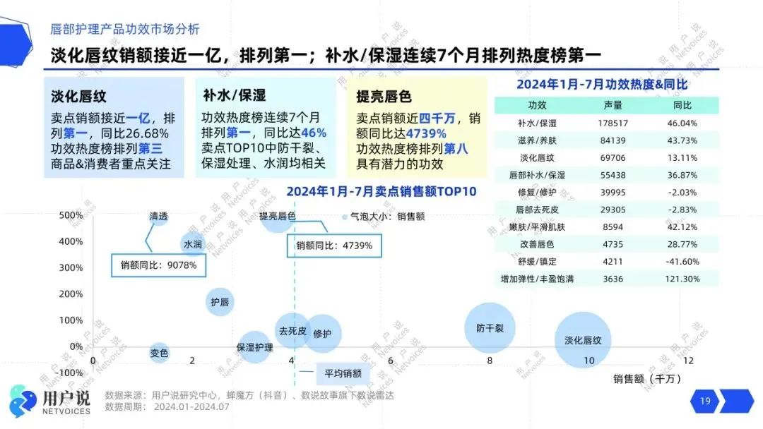 据用户说数据显示,补水保湿功效已连续7个月霸榜功效热度榜NO.1,声量同比上涨46%;淡化唇纹卖点销售额近1亿;而以提亮唇色为卖点的唇护产品,在近7个月内销售额实现了4739%的高速增长,位列功效热度榜单第八,成为赛道中最具潜力的功效卖点。