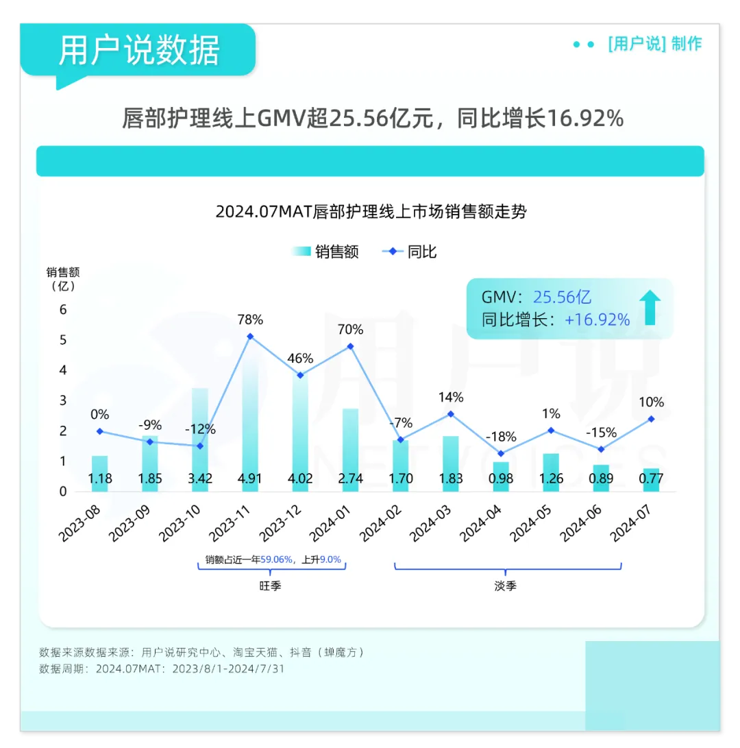 从大盘来看,唇部护理市场处于持续增长期,具有较强季节属性。据用户说数据显示,2024.07MAT淘宝天猫、抖音双平台,唇部护理品类线上GMV突破25亿元大关,较去年同期增长16.92%。其中,秋冬季为销售旺季,旺季销售额约占市场份额的59.06%,在平台促销活动加持下,2023年11~12月唇部护理产品销售额达到周期内峰值。
