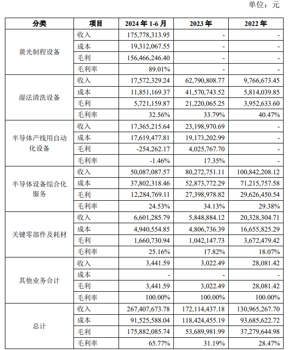 2024年上半年,芯慧联新增黄光制程设备业务,收入达到1.76亿元,毛利率高达89.01%,这个毛利率水平高于任何一家A股半导体设备公司。芯慧联在备注中指出,黄光制程设备业务因技术难度大,相关设备较为紧俏,因此售价较高,毛利率水平较高。