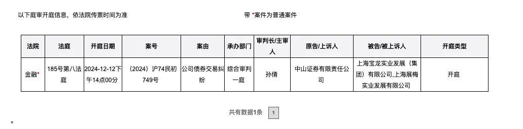 而中山证券作为原告的案件涉及上海宝龙实业发展(集团)有限公司(以下简称“宝龙集团”)、上海展梅实业发展有限公司(简称“展梅实业”),涉案金额1.07亿元,为公司债券纠纷。据上海市高级人民法院官网披露,该案将于2024年12月12日开庭审理。