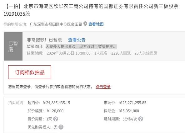 今年以来,中小券商股权被转让、拍卖的事项并不少见。如今年8月25日,北京市海淀区欣华农工商公司持有的国都证券1929.10万股在京东司法拍卖网拍卖,起拍价为2527.13万元,折合每股约1.31元。不过,因案外人提出异议,该笔股权已暂缓拍卖。
